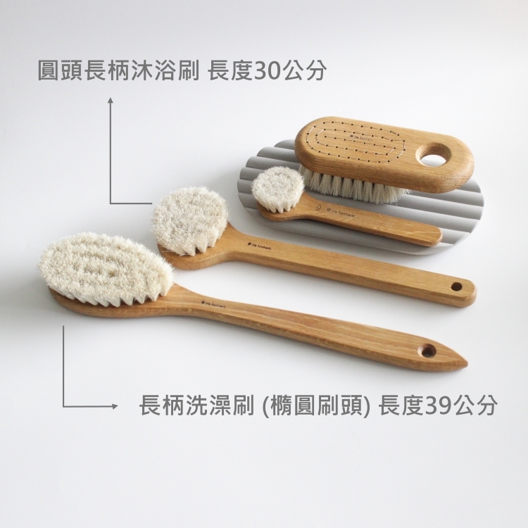 「圓頭長柄沐浴刷」長度30公分,易於清潔全身,是多數人順手好拿的尺寸,輕巧易使用。
