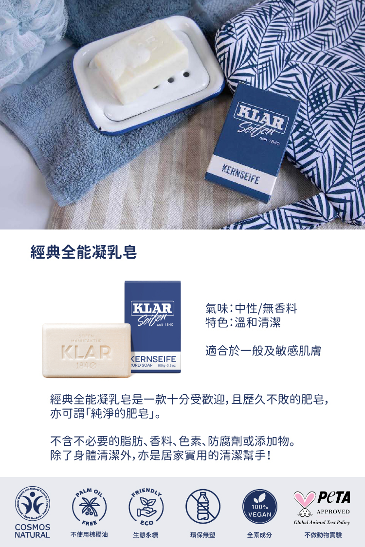 德國KLAR Seifen 純淨植皂 100%純素,不含防腐劑、人工界面活性劑。