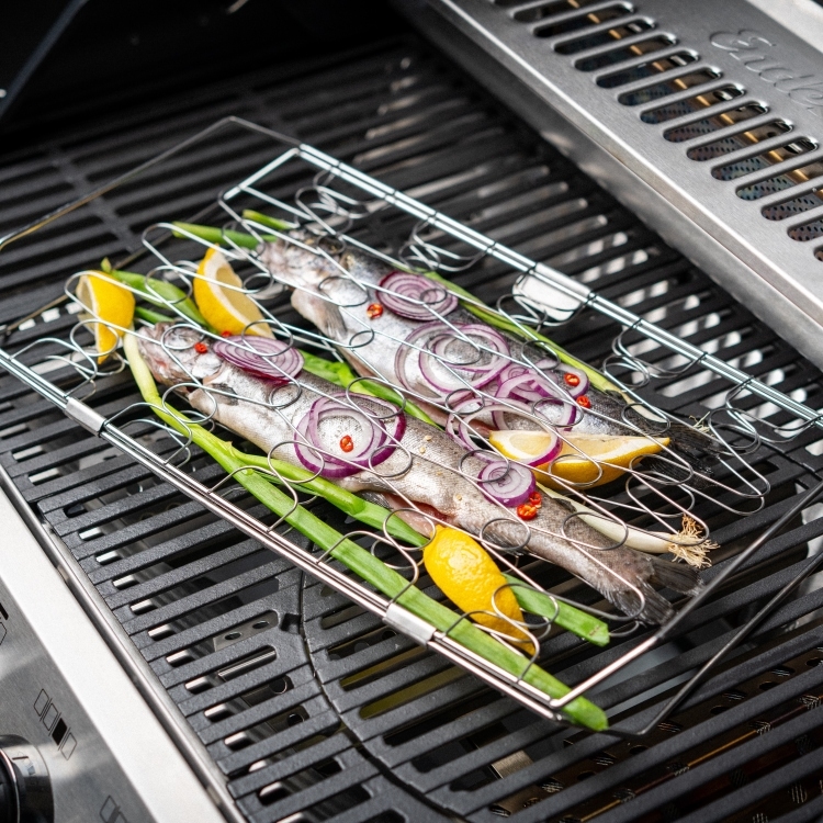 不鏽鋼製成的雙面烤網,可將魚、海鮮、蔬菜等食材固定,不易滑落,並能輕鬆地將食材翻面燒烤。