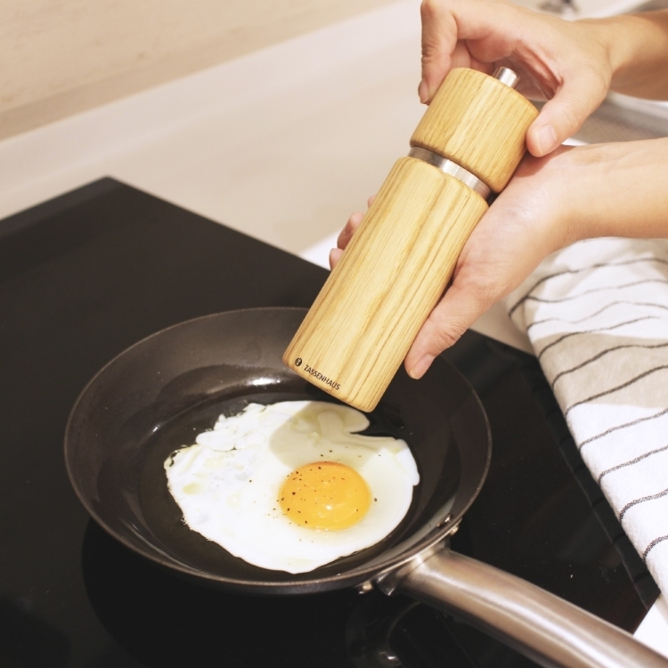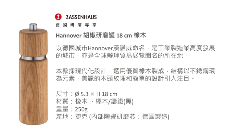 本款Hannover 胡椒研磨罐採現代化設計,選用優質橡木製成,結構以不銹鋼環為元素,美麗的木頭紋理和簡單的設計引人注目。