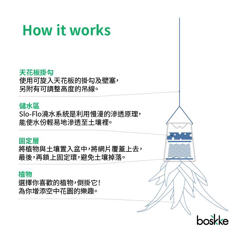內容物:盆器(含扣環)、Slo-Flo澆水系統陶塊、掛鉤、壁塞、網片