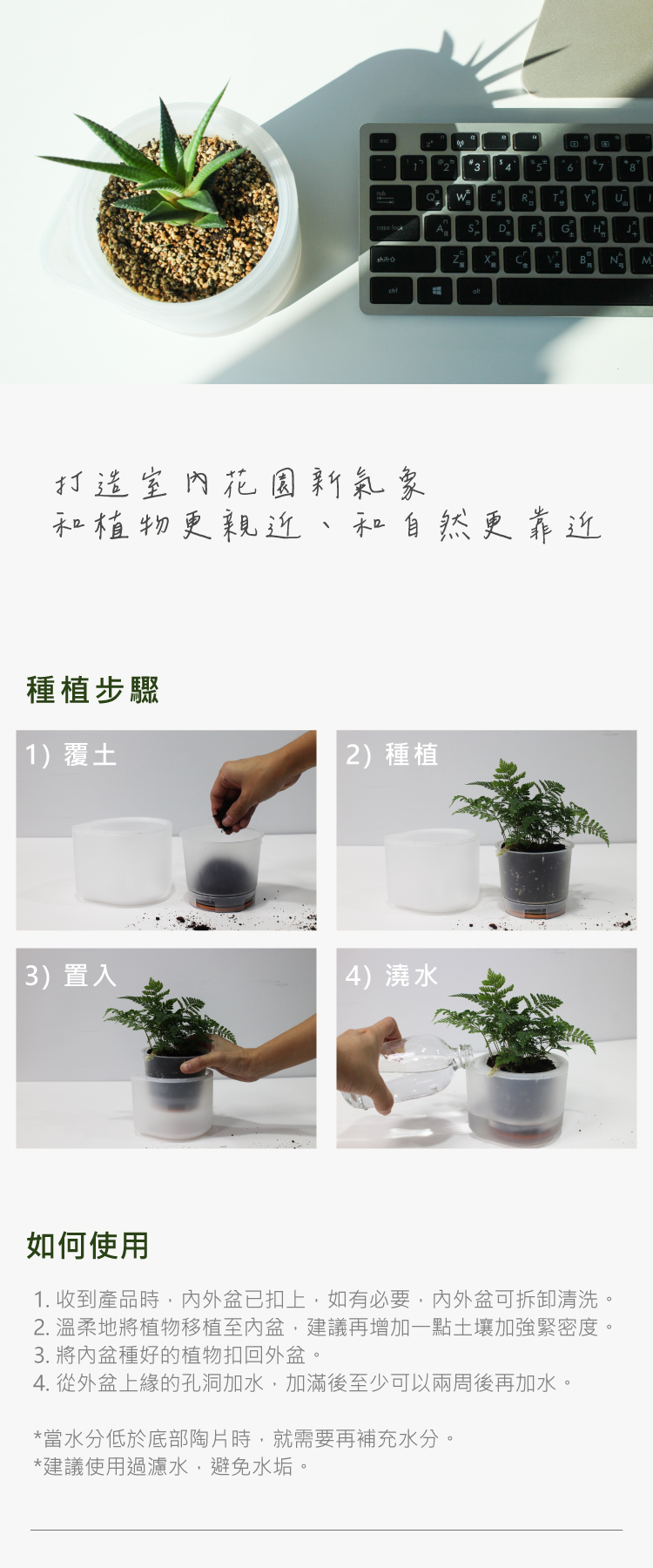 ◆ 懶人花器:簡約霧面外觀,可直視水分是否需要再補充,不用天天澆水好方便。